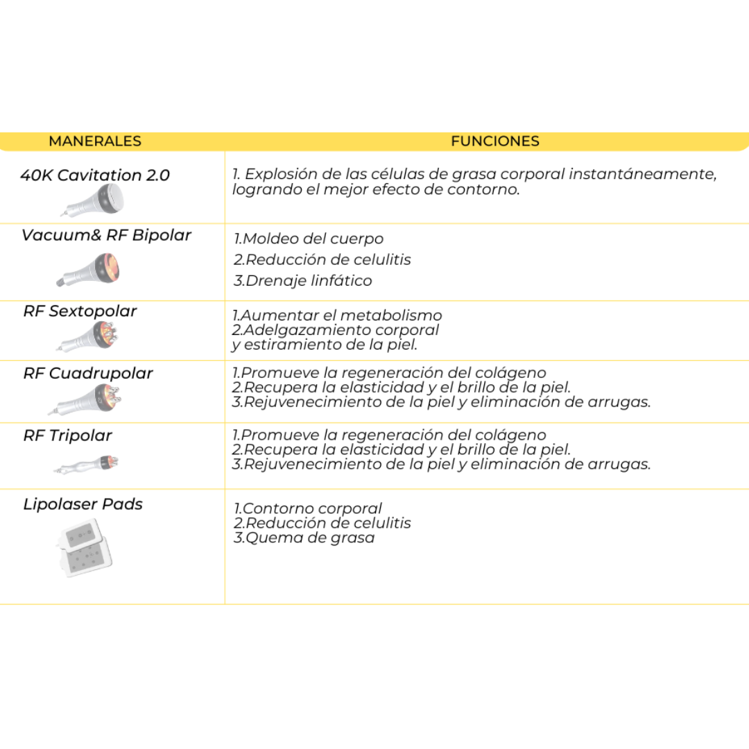 - 1 x Cabezal de cavitación 40KHz: Para todo el cuerpo